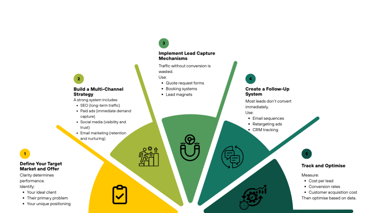 These businesses can generate consistent leads by implementing a structured marketing system that includes targeted SEO, paid advertising for high-intent searches, lead capture mechanisms, and automated follow-up processes. Consistency comes from integrating these elements into a continuous, data-driven strategy rather than relying on occasional campaigns.